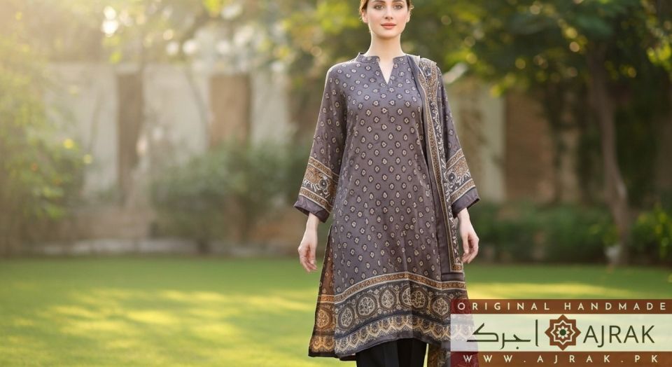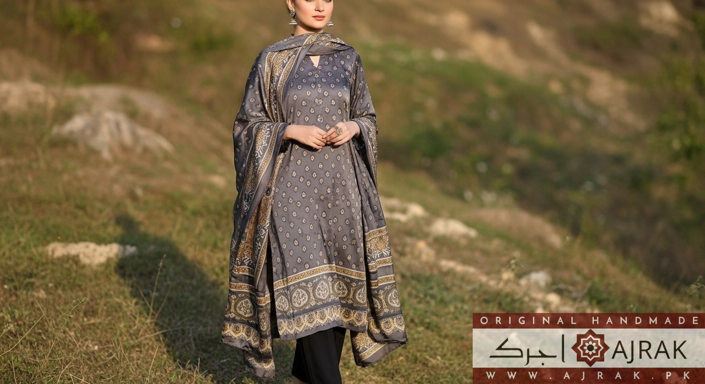An elegant handmade Ajrak silk suit in soothing grey tones adorned with motifs — a perfect blend of Sindhi tradition and modern grace.