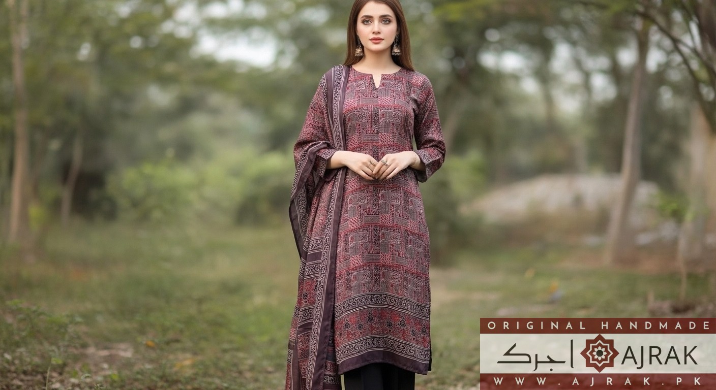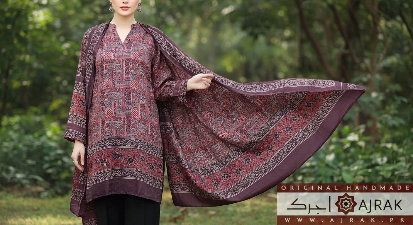 A timeless handmade Ajrak silk suit featuring traditional Sindhi block prints in earthy maroon and black tones — elegant, graceful, and authentically crafted for heritage lovers.