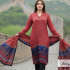 “Shafaq-e-Sindh” captures the poetic charm of Sindhi craftsmanship with its glowing red tones and intricate indigo detailing, blending heritage with grace.